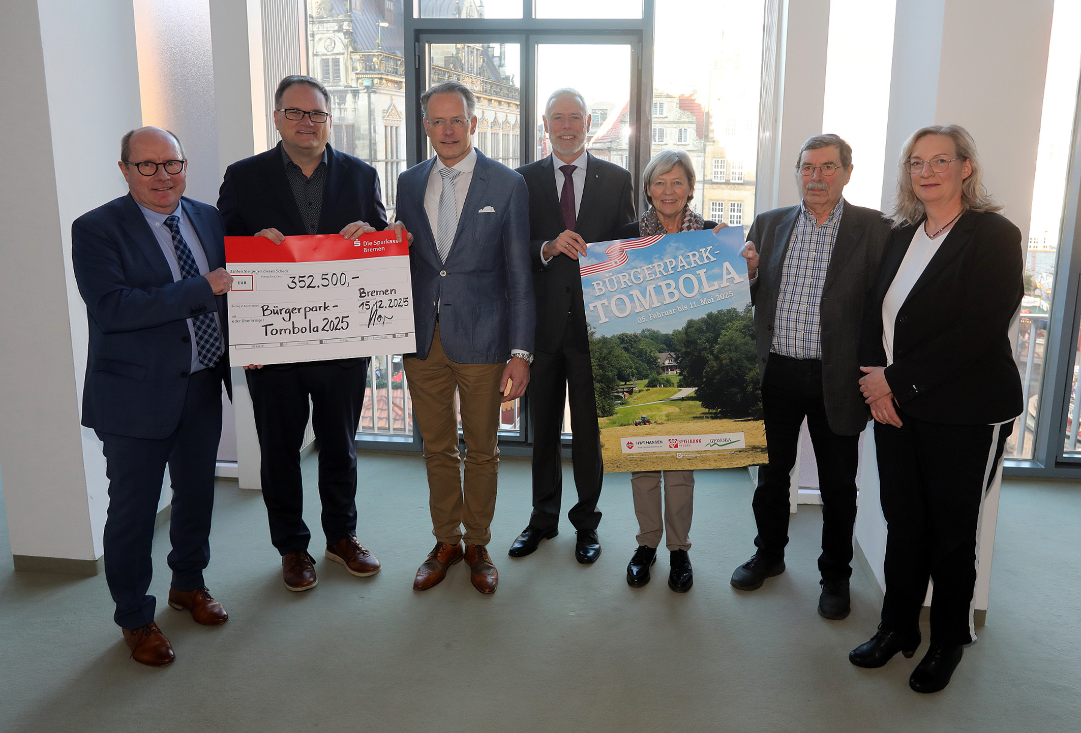 v.l.n.r: Dietmar Hoppe (Geschäftsführer Bürgerpark-Tombola), Björn Fecker (Senator für Finanzen), Prof. Dr. Dietrich Grashoff (Präsident Bürgerparkverein), Tim Großmann (Direktor Bürgerpark), Gudrun Stuck (Stellv. Vorsitzende Freunde des Rhododendronparks e.V.), Horst Meyer (1. Vorsitzender Park links der Weser e.V.),Karen Haltermann (Vorsitzende Lür-Kropp-Stiftung)